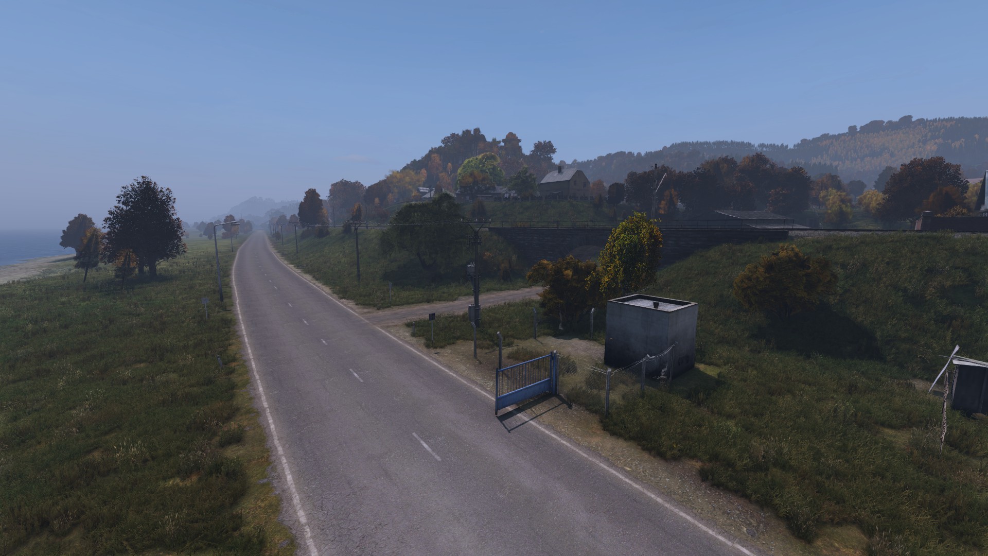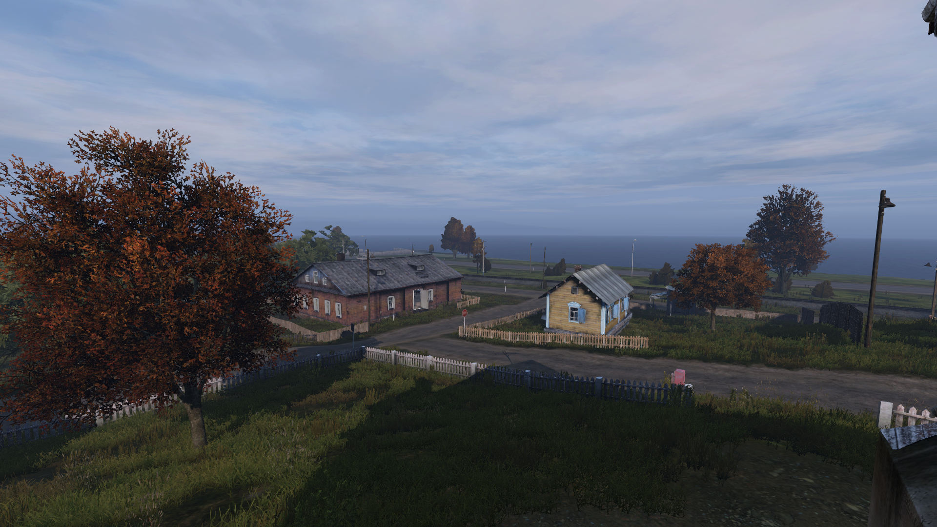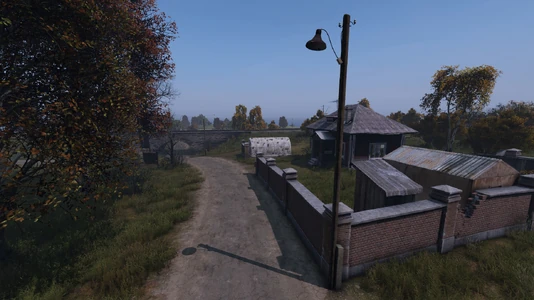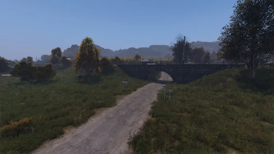 Nizhnee is perhaps one of the easiest locations to identify quickly after spawning. The main road runs side-by side with a railroad, and a small but steep hill separates the two from the buildings on top. A stone bridge with a pavement underpass is the entry into town, and the scene does not appear anywhere else on the coast.
